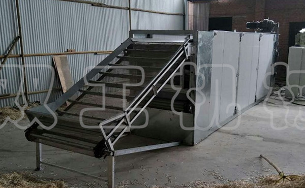 是將物料均勻地平鋪在網(wǎng)帶上,網(wǎng)帶采用12-60目的鋼絲網(wǎng)帶,由傳動裝置拖動在干燥機內(nèi)往返移動,熱風(fēng)在物料間穿流而過,水蒸氣從排濕孔中排出,從而達到干燥的目的,箱體長度由標準段組合而成,為了節(jié)約場地,可將烘干機制成多層式,常見的有二室三層、二室五層、長度6-40m,有效寬度0.6-3.0m。